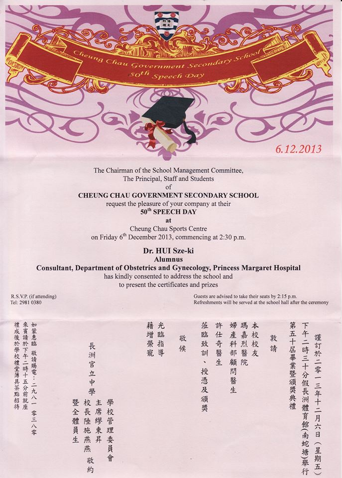 日 期: 2013年6月28日(星期五) 時 間: 7:00pm 詳情請電:90520769 與許先生聯絡,或登入網頁:http://www.ccgss.edu.hk/ |
