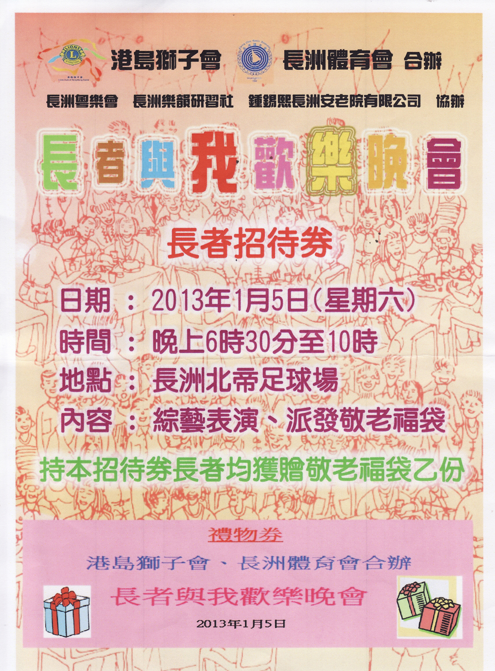 日期: 2013年1月5日(星期 六) 地點: 長洲北帝足球場 時間: 晚上六時三十分 內容: 綜藝表演、派發敬老福袋 |
